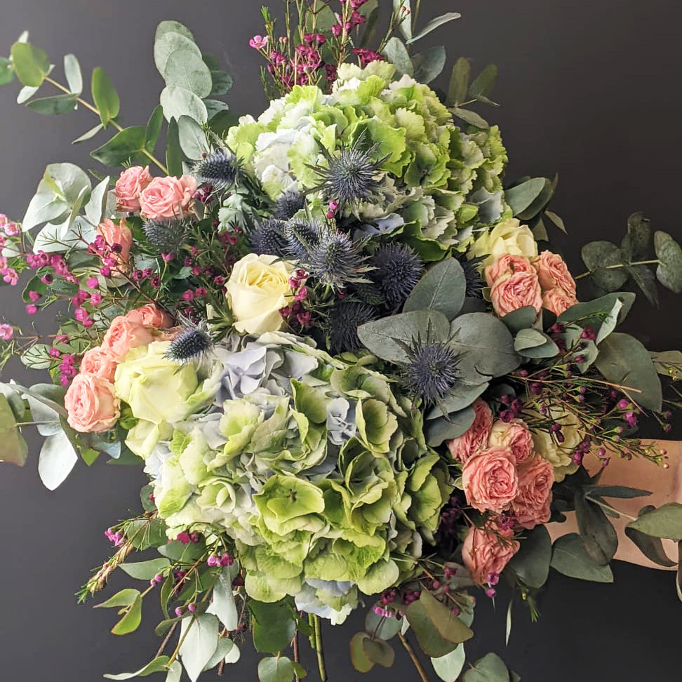 The arrangement is centred around soft pink hydrangeas, white avalanche roses, pink wax flowers, spray roses and complimented with fragrant eucalyptus and sea holly thistle.